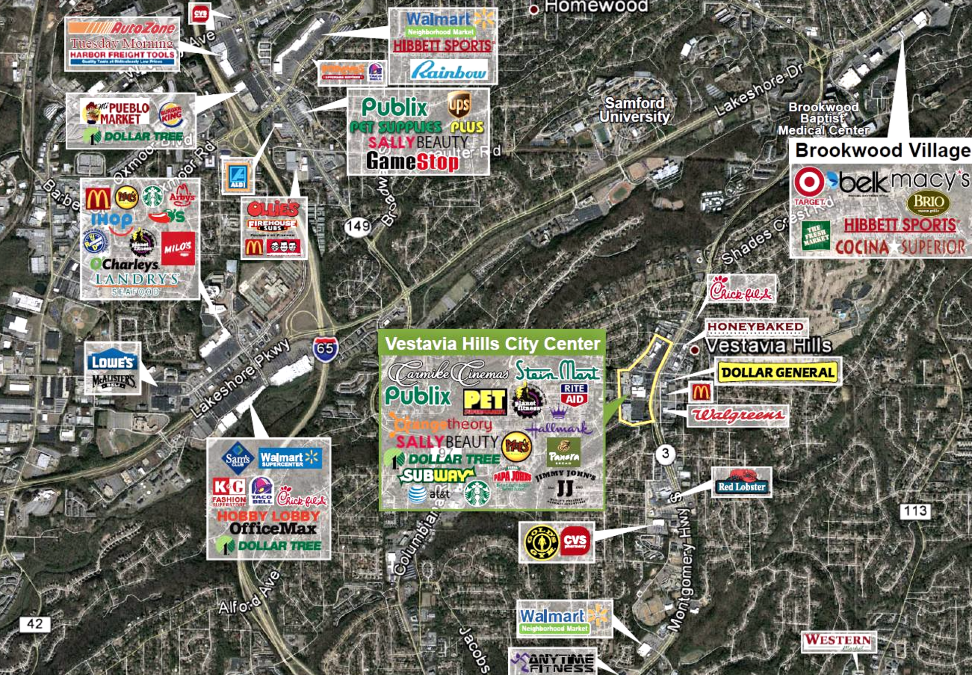 Vestavia Hills City Center is a premiere 391,899 regional power center within a heavily traveled, dynamic retail market just outside of Birmingham, Alabama - the largest city in the state and economic hub for the southeast. The center is anchored by a diverse tenant mix including Publix, AMC Theatres, Shoe Station, Dollar Tree, and Planet Fitness. In addition, the superior outparcel structures feature first-class national tenants in AT&T, Starbucks, Hand & Stone and a variety of national, regional and local restaurant operators. Vestavia Hills City Center is conveniently located right off Montgomery Highway with signalized access and traffic counts of more than 32,000 VPD.